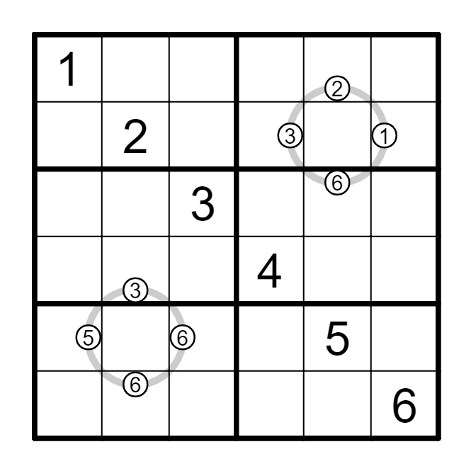 Classic rules applied. Additionally, the digits on the circles have to be placed in the same circular order in the four cells that are touched by the circle. The circles may have to be rotated to the correct position by 90, 180 or 270 degrees.