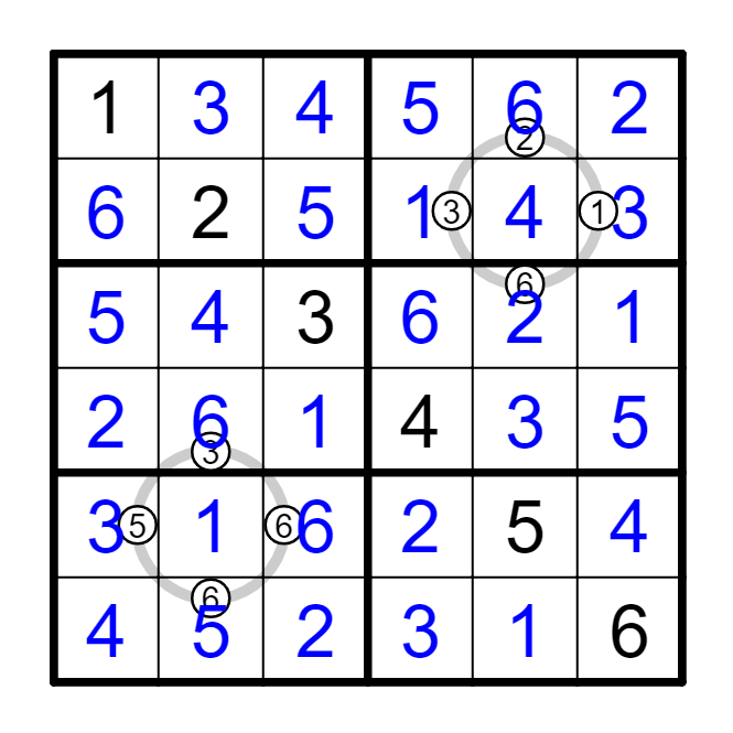 例 上文例题中E1和E3不是5,因此,E1和E3是3和6的数对,而D2和F2是5和6的数对。