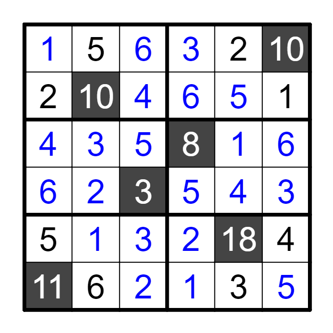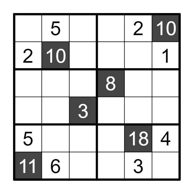 填入1~N,使得每行、列、宫内数字不重复。其中黑色格不需要填入数字。黑色格中的提示数,表示该格所在的行、列、宫内,缺失的所有数字的和。