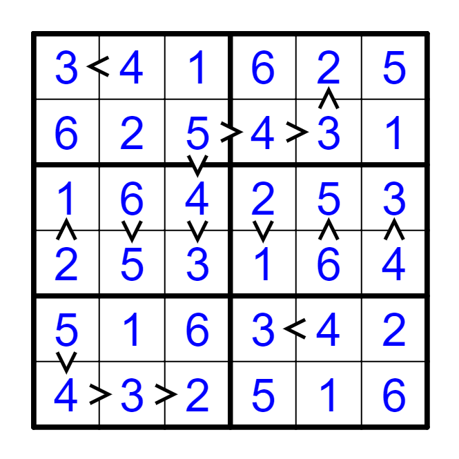 标准数独基础上,如果相邻两格数字之差为1,那么就用不等号表示其大小关系。所有符合条件的情况都被全部标记。