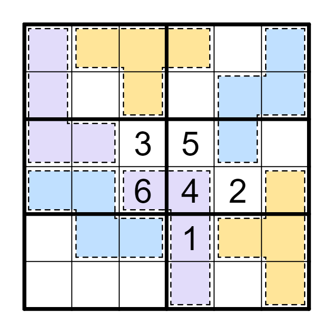 标准数独基础上,相同形状的区域里包含相同的一组数字,不同形状的区域里包含的两组数字有所不同。