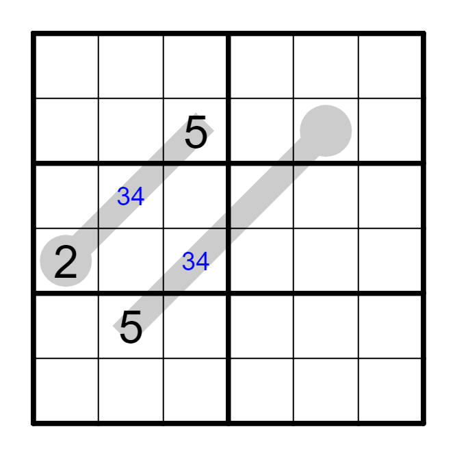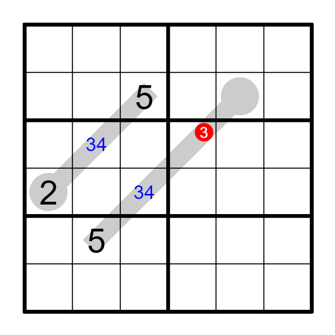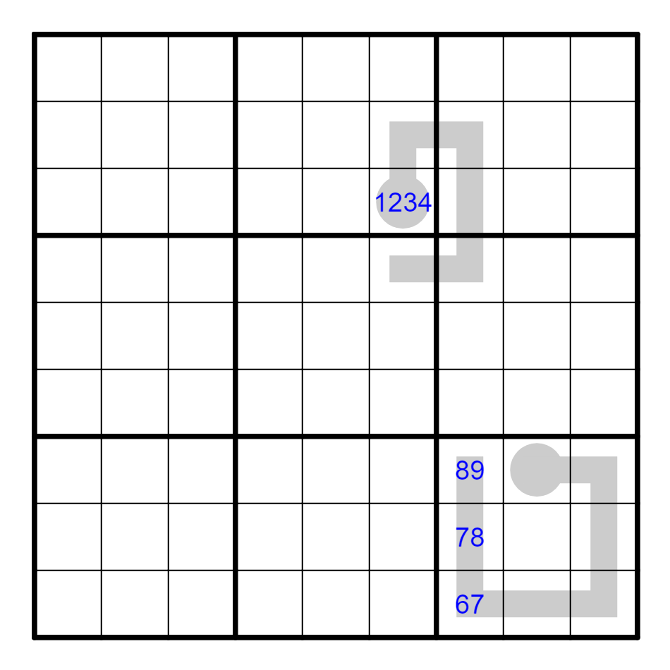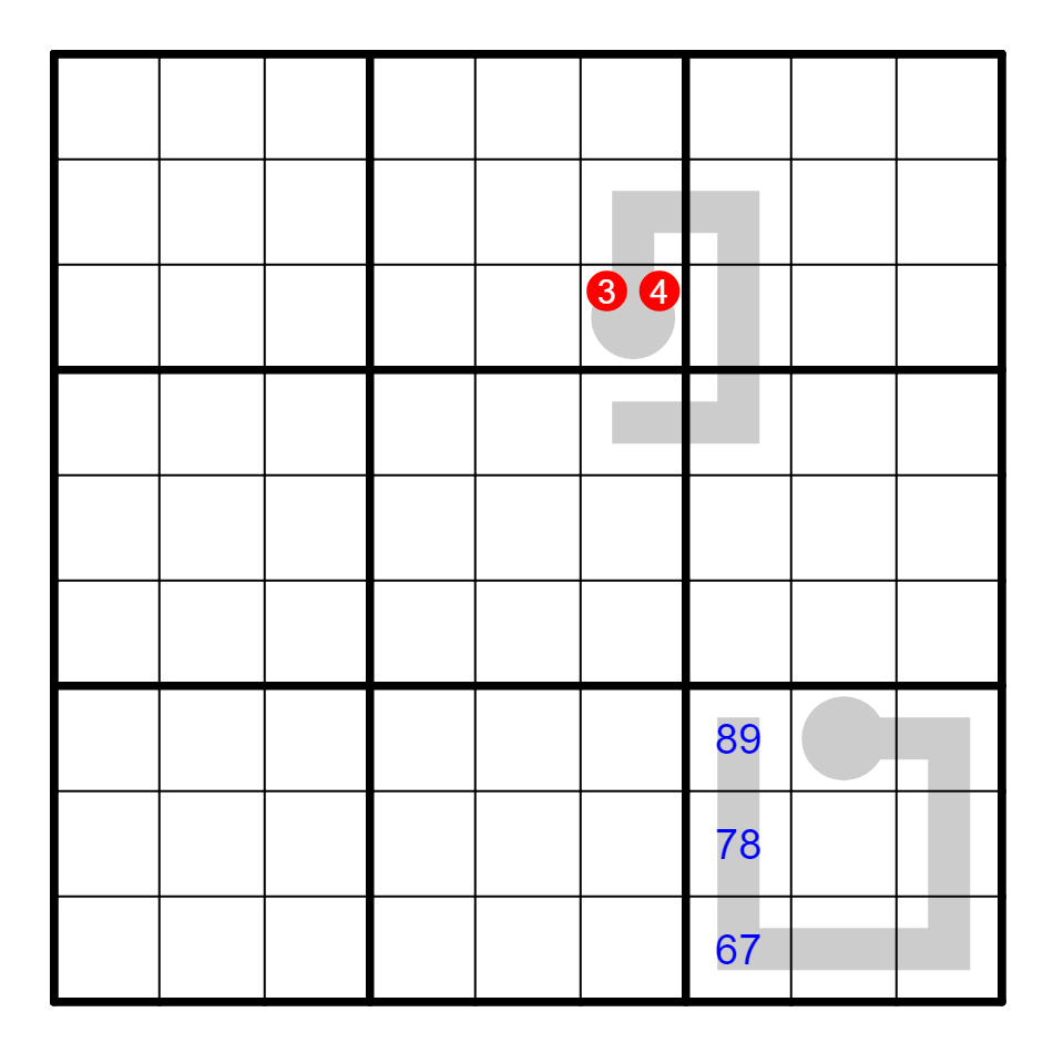 例如下图中,从起点S起,到达A的温度计线长为5,到达B的温度计线长为3。对于处于温度计岔路口的单元格(例如下图C格),讨论其候选数情况时,应当应对不同的分岔线进行分类讨论,并取其候选数集的交集。