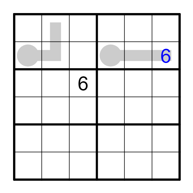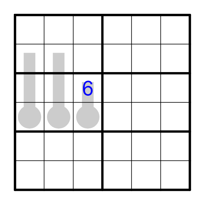 观察数字N(N是阶数,也是盘面内最大的数字)也比较容易,以六阶数独为例,最大的数字6只能在白格,或是温度计的末尾。