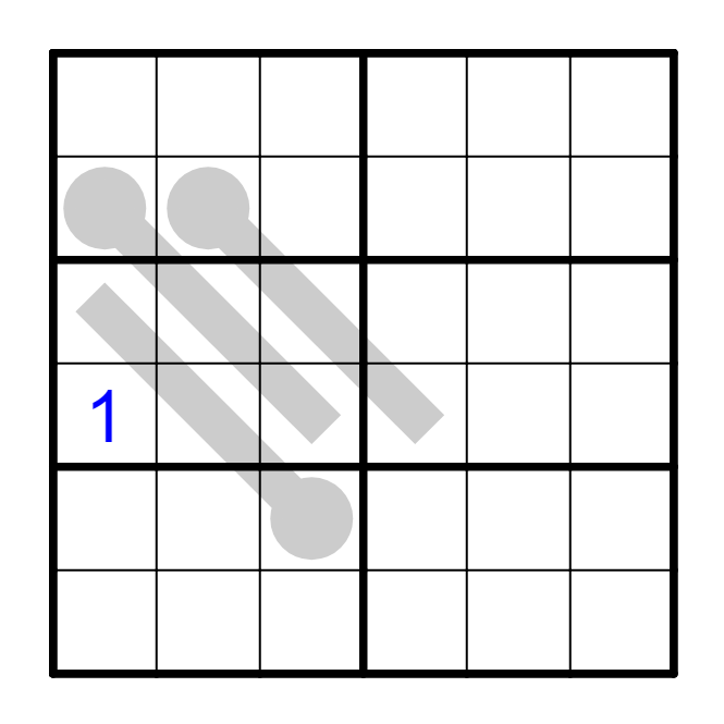 很显然的是,数字1不能在任何温度计的直线部分上(可能在圆球或白格)。因此,单纯定位数字1,会比不等号数独中同样的操作,在观察上更为容易。