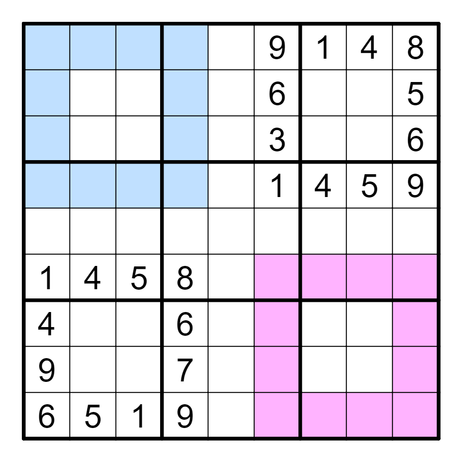 标准数独基础上,两个涂色区域中,相同的位置对应的数字一致。