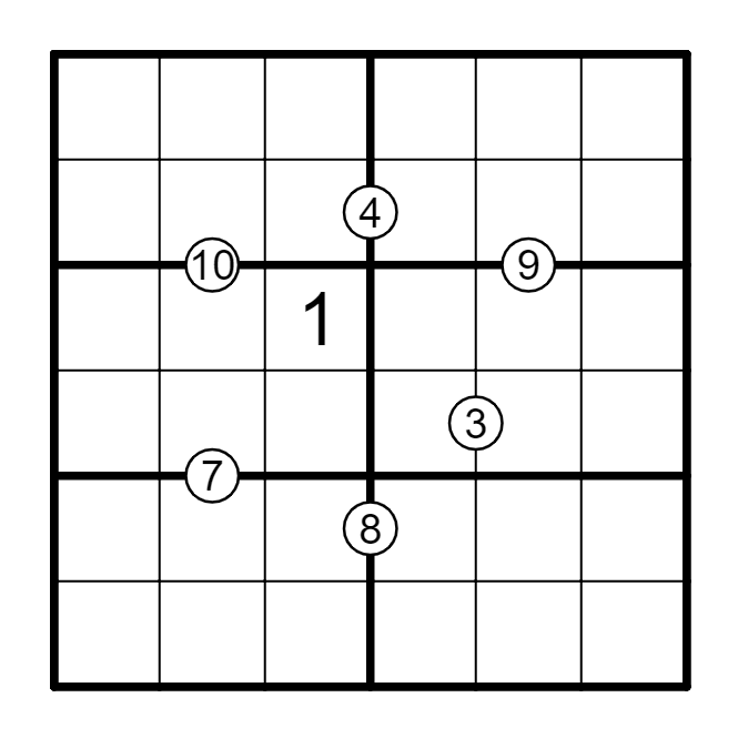 Classic rules applied. Additionally, numbers in circle is the sum of the numbers around it.