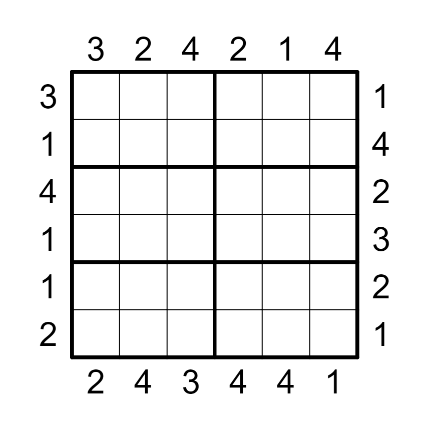 填入1~4,使得每行、列、宫内数字都是1~4不重复,并且余下两个空格(不填入任何字符)。外提示是这一方向上的第一个数字。