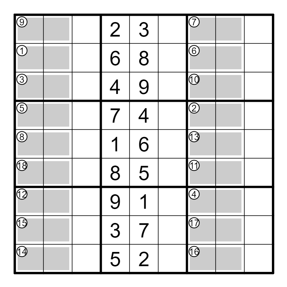 标准数独基础上,每个区域内都是从左到右、从上到下的两位数,提示表示这些多位数从小到大进行排序的序号。