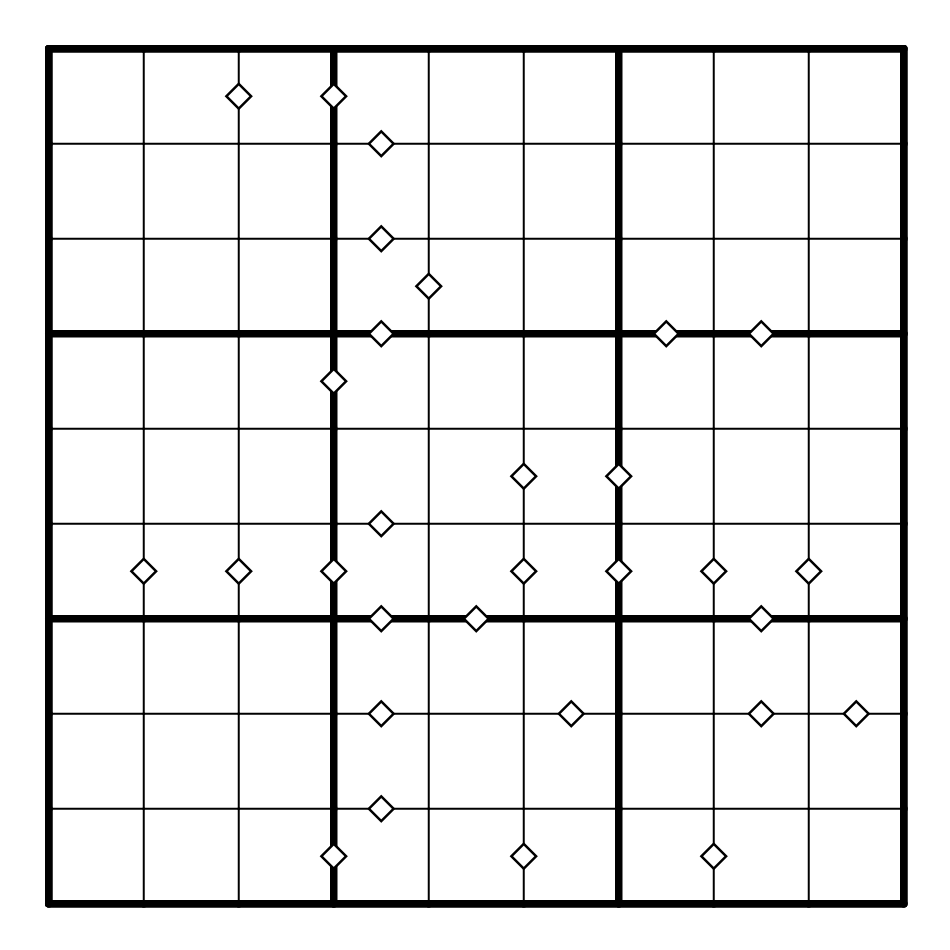标准数独基础上,如果水平/垂直相邻的两格之间有一个钻石标记,那么这两格的差等于该行/列的第一个数字。符合条件的所有情况都被标记。