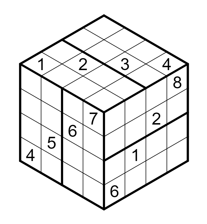 填入1~8,使得每宫内及每行列(三种方向上)数字不重复。