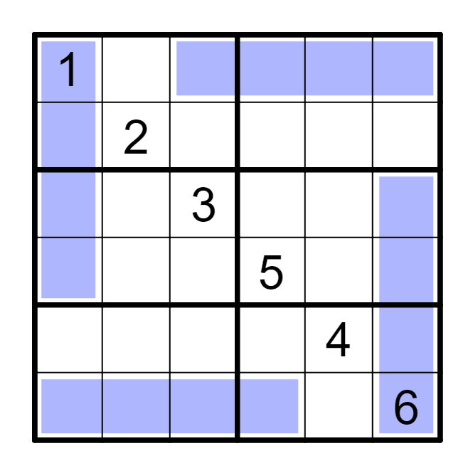 标准数独基础上,每个涂色区域中是一组连续的数字(可能是乱序)。