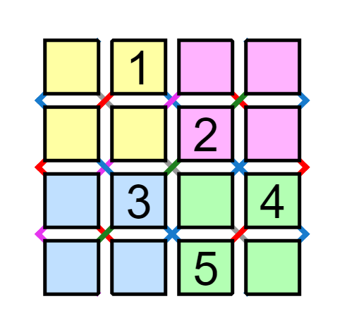 填入1~5,使得每宫内,以及每组由线条连结的四个单元格内,数字均不能重复。每根线条最多拐弯一次,且数字可能在行列内重复。