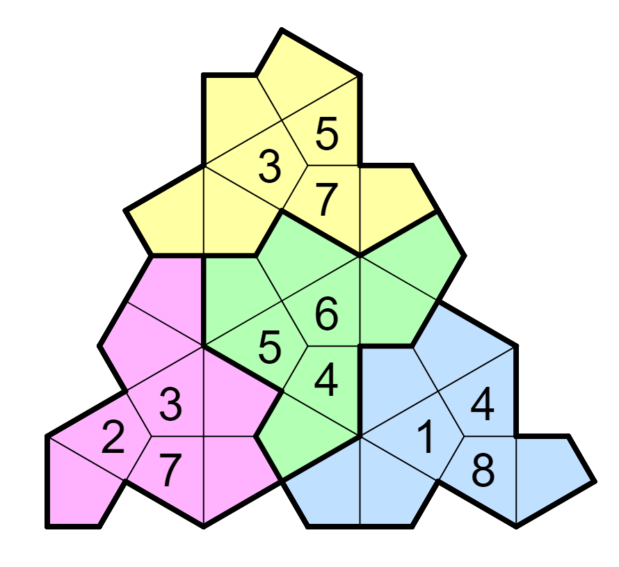 填入1~8,使得每宫内及每行列(三种方向上)数字不重复。