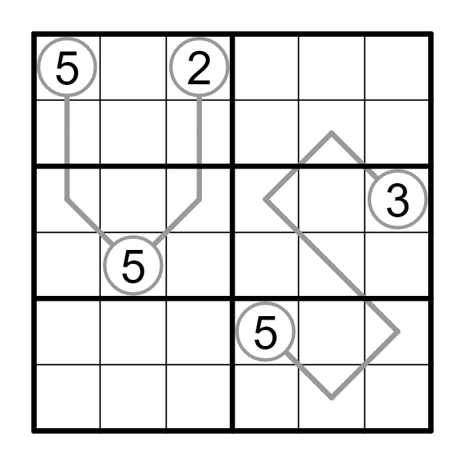 标准数独基础上,每条线条上的数字之和等于两侧圆圈里的数字之和。