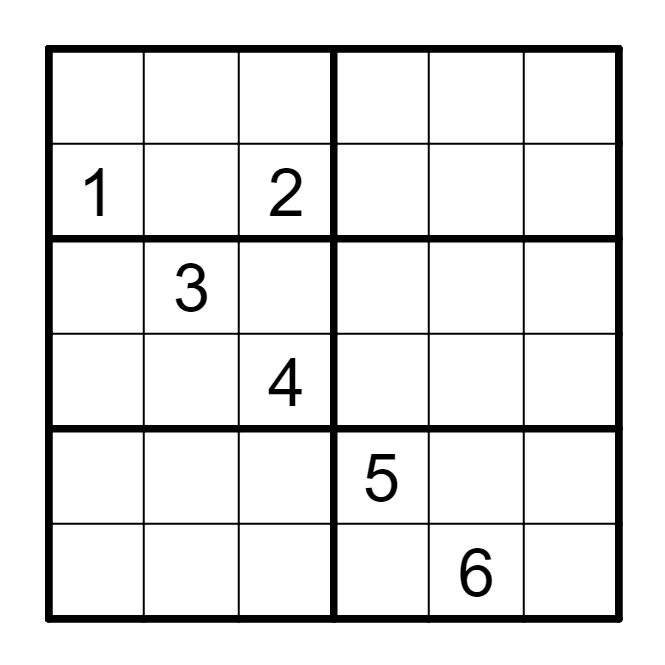 填入1~7,使得每行、列、宫内数字不重复。任意两个呈马步的单元格中,不能有相同的数字。
