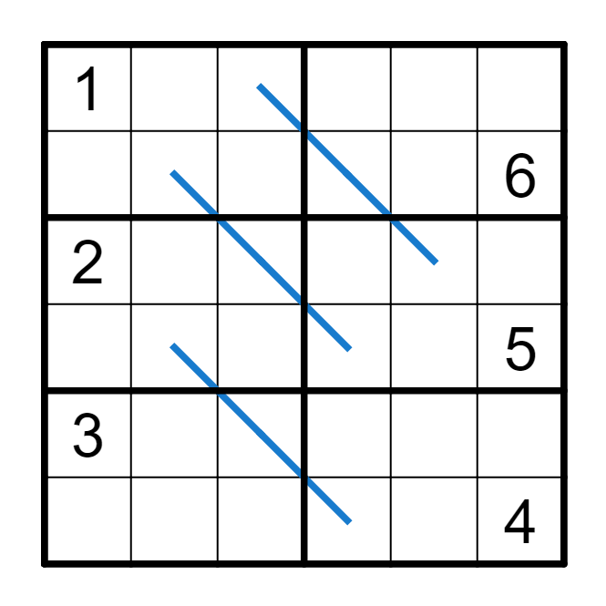 标准数独基础上,每一条线条在它经过的每个宫内的每一段,数字之和相同。