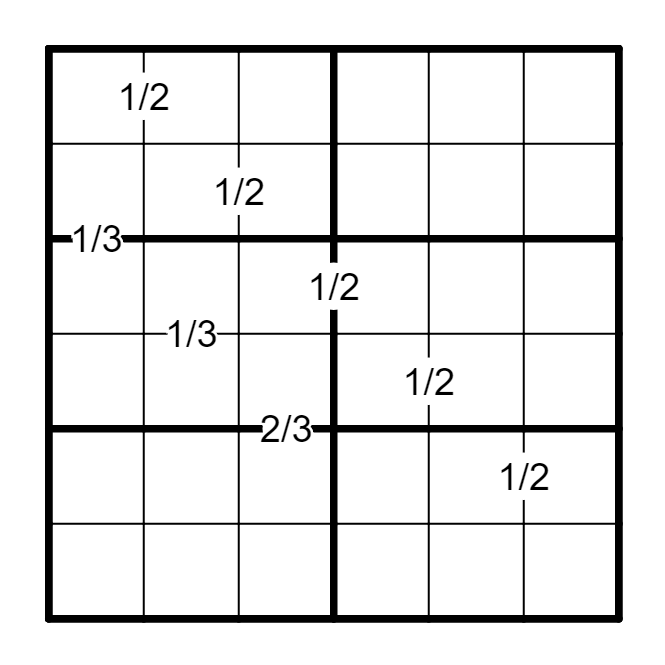 Classic rules applied. Additionally, the clue is the ratio of numbers next to it.