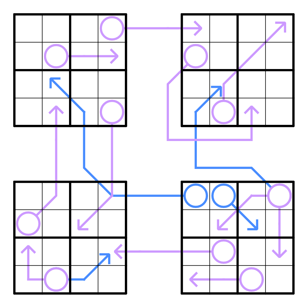 标准数独基础上,每条线条上的数字之和等于圆圈里的数字。本题由四个四阶数独组成(仅使用1~4),盘面之外不包含数字。