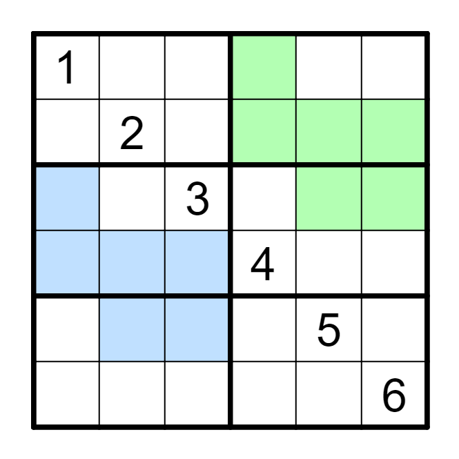 Classic rules applied. Additionally, in the 2 colored zones, same position own same number.