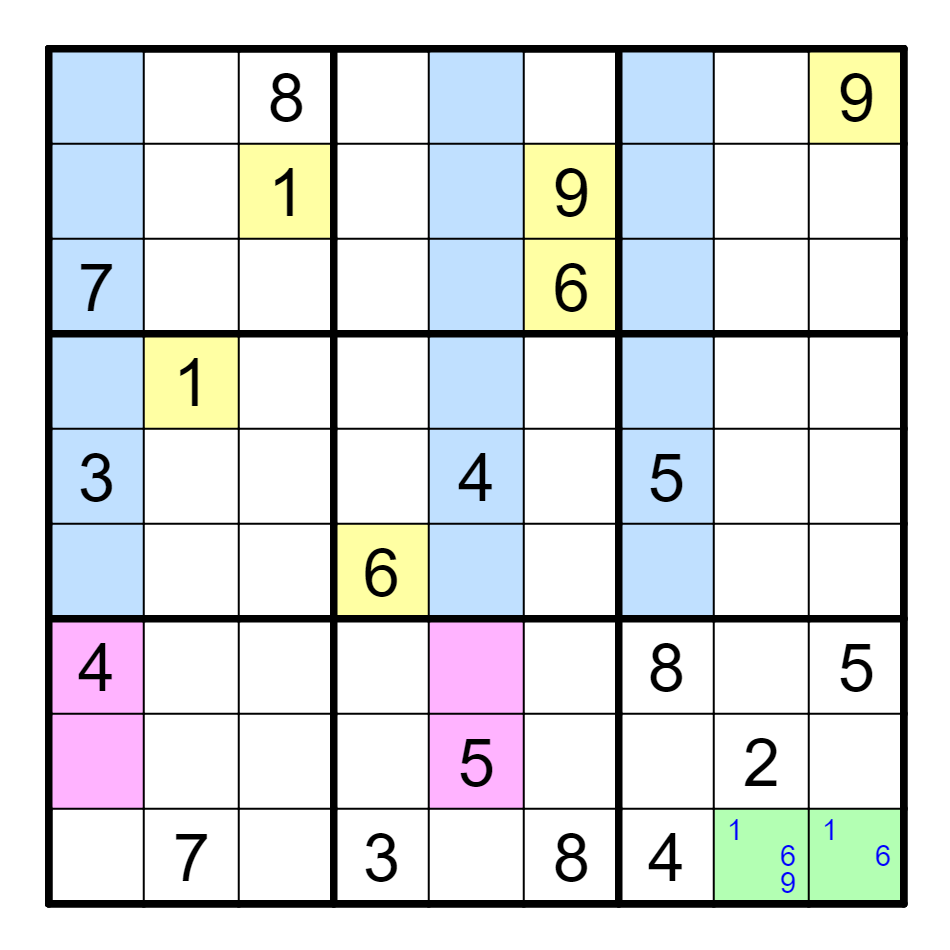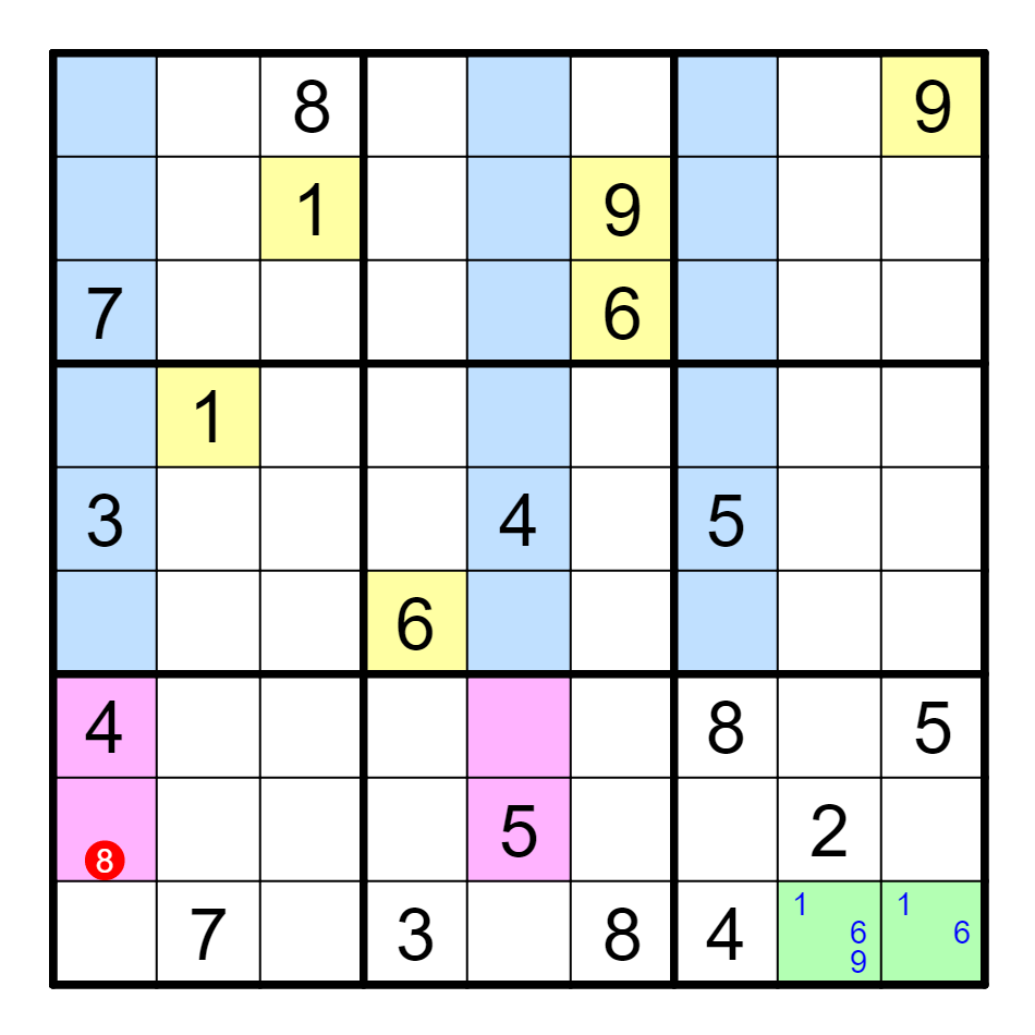 *本题使用了名为Junior Exocet(简称JE)的技巧。观察蓝色区域内1、6、9的位置,结合绿色区域,可以得到粉色区域内的G5和H1都只能是1、6、9。