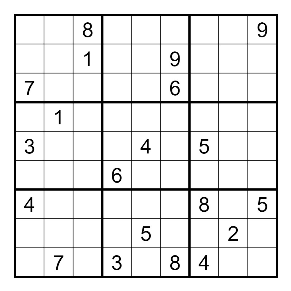 [VSI Warning]:8星题涉及高级技巧(一般是链技巧以上),但有明确的逻辑解途径。此题涉及的技巧在标准数独技巧体系中较为艰深,且本站目前尚无相关技巧文章(因为笔者尚未完全掌握)。本页面下方会贴出由作者给出的一个提示,解题者们可以自行观察及思考。