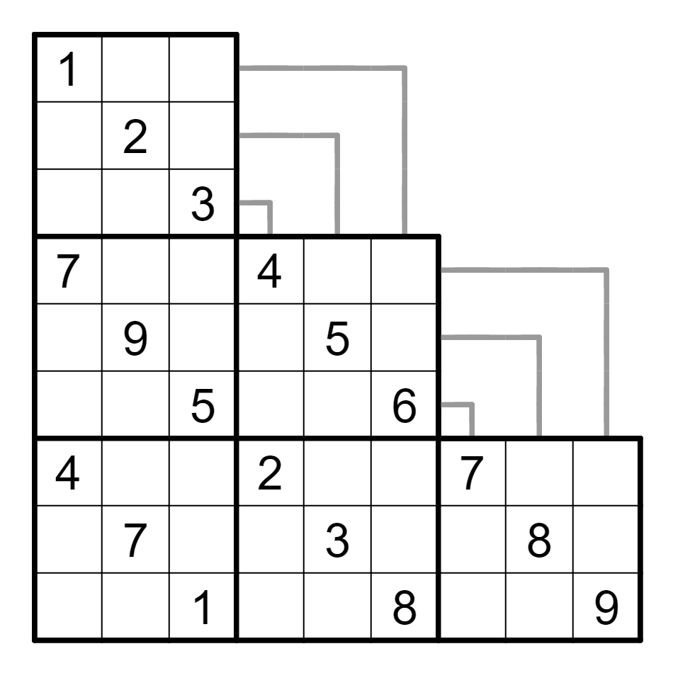 填入1~9,使得每行、列和每个管道上数字都不重复。