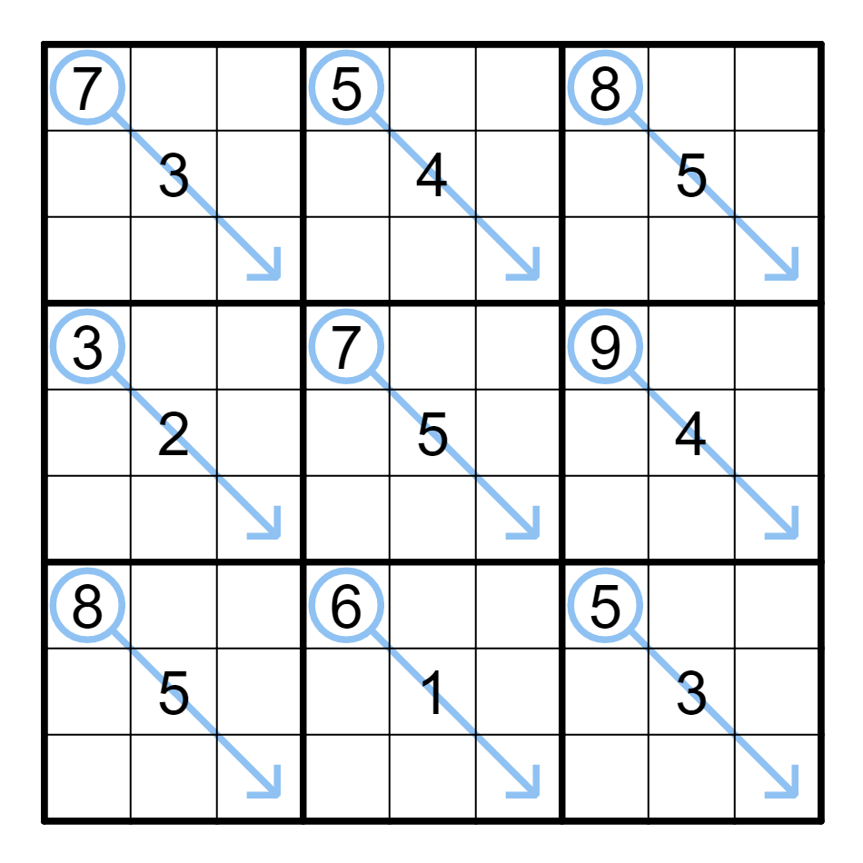 标准数独基础上,每条线条上的数字之和等于圆圈里的数字。