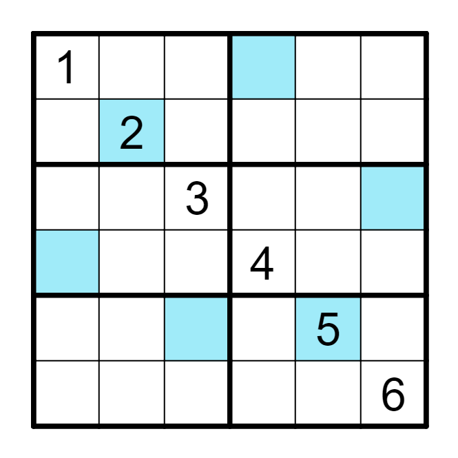 Classic rules applied. Additionally, numbers 1~6 cannot repeat in each colored region.